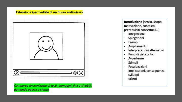 Parlando di autorialità, abbiamo definito la regia di secondo livello e parlato di estensione ipermediale. I video interattivi sono il punto di giunzione di questi approcci professionali, cognitivi e culturali all’uso di filmati come dispositivi di mediazione didattica.